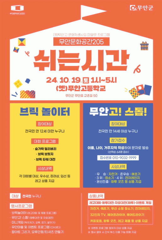 행사는 어린이부터 노령층까지 다양한 연령이 즐길 수 있는 고등학교의 쉬는시간을 떠올리게 하는 놀이콘텐츠 프로그램으로 ▲블록을 활용한 3가지 주제의 대회와 자유롭게 체험하는 ‘브릭놀이터’ ▲(옛)무안고와 무안군 상징 이미지를 이용해 제작된 화투를 활용한 ‘무안고! 스톱!’ ▲딱지치기와 오목, 장기, 알까기 등 ‘미니게임’ ▲부루마블의 형태를 응용한 체험존 ‘무안마블205’ ▲굿즈만들기(팝아트 그리기 모루인형 만들기, 나만의티셔츠 만들기) 등 5가지 콘텐츠가 준비됐다.