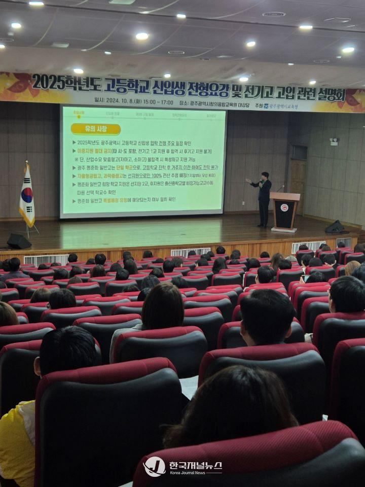 또 2025학년도 자율형 공립고 신규 지정, 광주형 마이스터고 신규 지정, 명진고등학교 남녀공학 전환 등의 내용을 전달하고, 입학전형 주요 일정 및 이중지원 금지 관련 정보, 원서 작성시 유의사항, 특별배정 유형 등에 대해 설명한다.