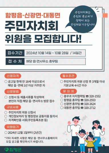 주민자치회 위원이 되려면 위원 선정 후 주민자치 기본교육 4시간을 이수해야 하며, 임기는 2년으로 연임이 가능하다. 기타 자세한 사항은 함평군 누리집 모집 공고문을 확인하면 된다.