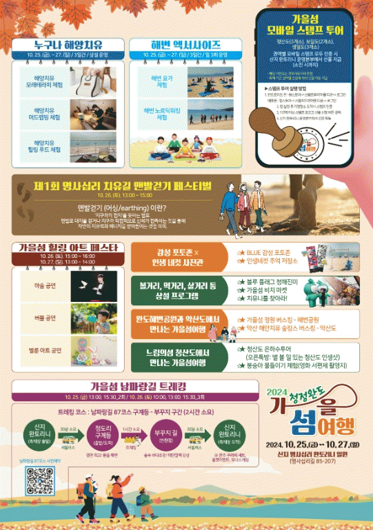 이번 행사는 국화 전시회와 해양치유 및 맨발 걷기 체험, 청산도 은하수 투어, 콘서트, 버스킹 공연 등이 진행된다.