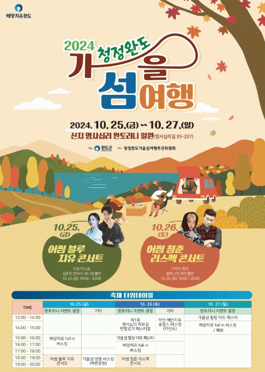 25일과 26일 저녁 6시부터 8시까지는 신지 명사십리 이벤트 광장에서 ‘어썸 블루 치유 콘서트’가 열린다.