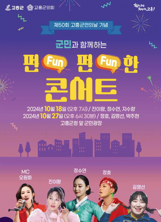 한편, 고흥군은 10월 한 달간 진행되는 ‘펀펀한 콘서트’ 외에도 ‘녹동항 드론쇼 거리공연(버스킹)’과 ‘수상한 외갓집’ 뮤지컬 공연 등 지역맞춤형 중소규모 콘텐츠 유통 사업 공연을 11월 말까지 진행할 계획이다.