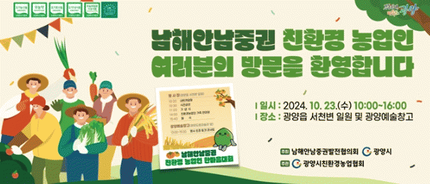 광양시는 오는 23일 광양읍 서천변 일원과 광양예술창고에서 제1회 남해안남중권 친환경농업인 한마음대회가 개최된다고 밝혔다.