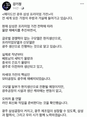 한편, 강기정 광주시장은 이날 사회관계망서비스(SNS)인 페이스북에 “삼성전자 광주사업장이 커지고, 광주 제조업이 성장할 수 있도록 삼성전자와 협력사, 그리고 광주시가 함께 노력해 나갈 것”이라며 “메이드인 광주 삼성 프리미엄 가전이 글로벌 경쟁력을 갖춰 전 세계 모든 가정의 주방과 거실에 들어갈 수 있도록 적극 협력하겠다”고 전했다.