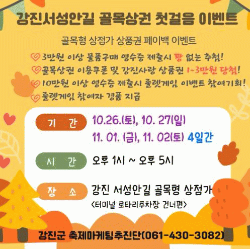 골목형 상점가 페이백 이벤트는 강진군 관내에서 소비한 3만 원 이상의 카드 영수증 제출 시, 추첨을 통해 골목상권에서만 사용할 수 있는 쿠폰과 강진사랑상품권을 1만 원부터 최대 3만 원까지 지급한다.
