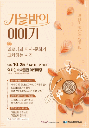 정민구 전남대 교수는 ‘가을밤, 시로 읽는 역사’를 주제로 오후 5시부터 오후 6시30분까지 강연한다. 이어 ‘가을밤의 우리 소리와 클래식’이라는 주제로 지역에서 활동하는 젊은 음악인들의 공연도 펼쳐진다.