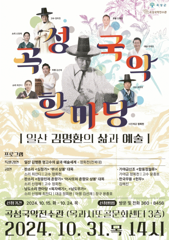 ‘곡성 국악 한마당’은 지역주민 80명을 대상으로 무료로 진행되며, 오는 24일까지 선착순으로 국악전수관에서 사전 신청을 받고 있다.