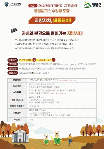 양은숙 영암군 자치행정과장은 “자치분권대학 가을학기 수강이 지역사회 발전에 기여하는 참여로 이어지길 바란다”라고 전했다.