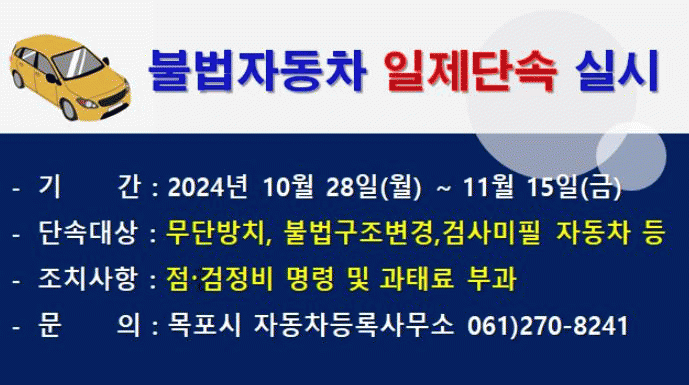 이번 ‘불법자동차 일제단속’은 목포시와 목포경찰서, 한국교통안전공단과 합동으로 진행하는 것으로, 민원 빈번 발생 지역을 중점으로 단속한다.