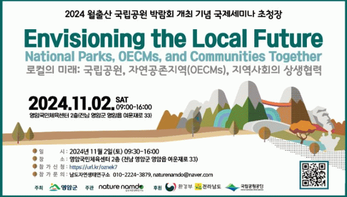 영암군이 ‘2024 월출산국립공원박람회’ 기간인 11/2일 영암국민체육센터에서 ‘로컬의 미래 : 국립공원, 자연공존지역, 지역사회의 상생협력’을 주제로 학술세미나를 연다.