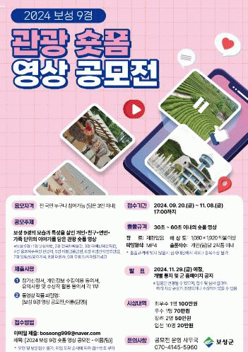 군 관계자는 “보성군의 아름다운 관광자원인 보성 9경을 보다 친숙한 방법으로 알리기 위해 이번 관광 숏폼 영상 공모전을 진행하게 됐다.”며 “영상 제작에 관심이 있는 분들의 많은 관심과 참여를 부탁드린다.”고 전했다.