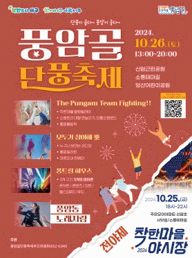 아울러 단풍축제에 앞서 25일 오후 6시부터 소통테마길(주은모아아파트~신암초 사잇길)에서는 착한마을 야시장 시즌2가 전야제로 진행된다. 지난 8월 개최한 야시장과 동일하게 매출 일정액(월 3만원 이상)을 매달 지속 기부하며 나눔을 실천하는 풍암동 착한가게 24곳이 야시장 운영에 참여해 지역상생의 의미를 더할 예정이다. 또한 더 많은 주민들이 편안하게 야시장을 즐길 수 있도록 테이블·의자·돗자리구역·스탠딩구역 등을 추가 구성해 700석의 자리를 마련했으며, 단풍과 갈대 등으로 구성된 포토존·불멍존도 준비했다.