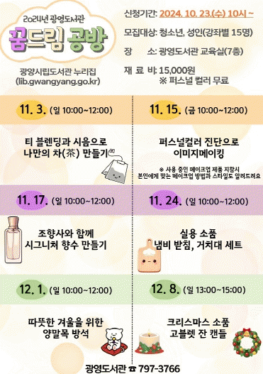참여 신청은 프로그램별 15명씩 선착순이며 중복 신청이 가능하다. 10월 23일 오전 10시부터 도서관 누리집에서 신청할 수 있으며 자세한 사항은 광영도서관팀으로 문의하면 된다.