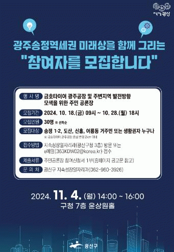 2부 주민 공론장에선 국토계획법 개정에 따른 ‘공간혁신구역’ 지정을 통한 공공개발, 금호타이어 광주공장 이전 추진 사항 및 향후 계획, 광주송정역세권 발전 범시민운동본부 활동 내용 등 발표와 주민토론이 진행된다.