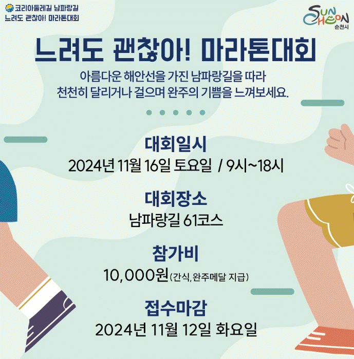 이번 행사는 해안선이 아름다운 순천의 남파랑길을 걸으며 자연경관을 감상하고 저마다의 속도로 완주하여 걷기에 관심을 가지고 힐링할 수 있는 시간을 제공하기 위해 마련됐다.