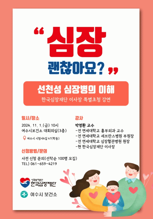 시 관계자는 “국내 심장질환 권위자인 박영환 교수님의 강의를 여수에서 들을 수 있는 좋은 기회”라며 “건강에 관심 있는 시민들의 많은 참여를 바란다”고 말했다.
