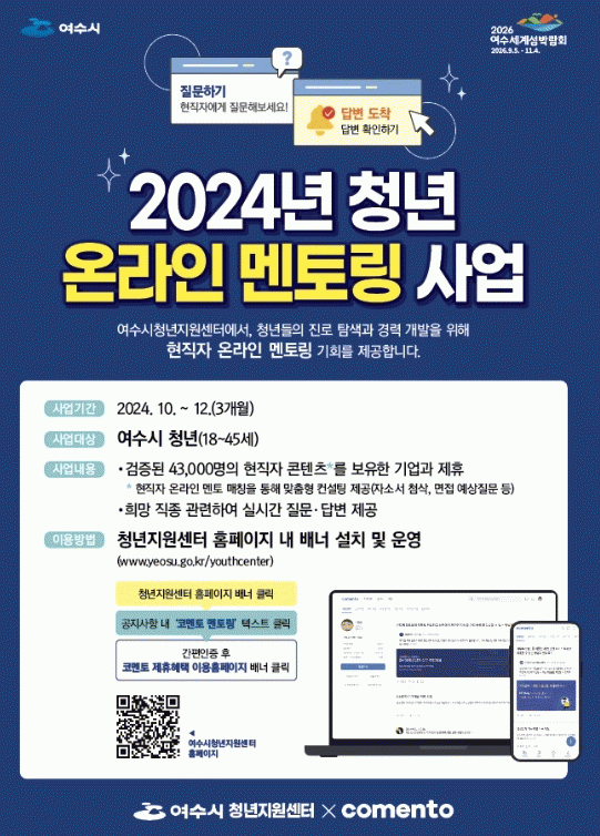 검증된 4만 3천여 명의 현직자 콘텐츠를 보유하고 있는 기업과 제휴해 마련한 이번 교육은 여수시에 거주 중인 18세 부터 45세 청년을 대상으로 하며, 희망 직종과 관련한 현직자와 매칭돼 청년들의 취업 준비 방향 설정에 도움이 될 전망이다.