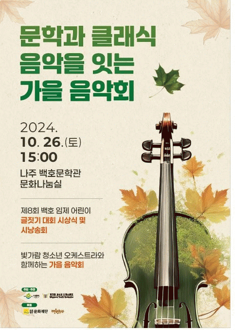 윤병태 나주시장은 “글짓기 대회에 참가해준 전국 어린이 작가들에게 고마움을 전한다”며 “문학과 음악이 어우러진 시상식과 시낭송 콘서트가 수상자·가족, 청소년오케스트라 단원, 관람객까지 나주에서 특별한 가을 추억이 되길 바란다”고 말했다.