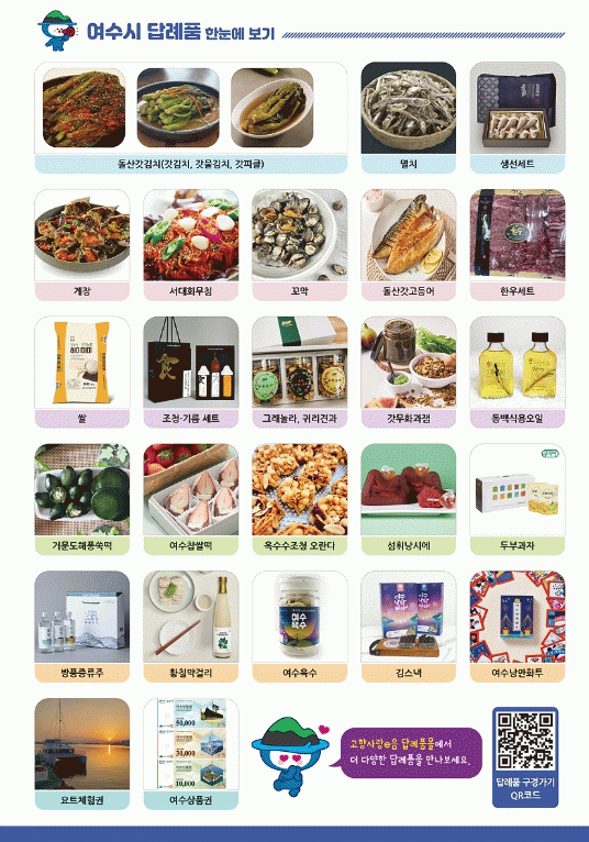 현재 여수시 고향사랑기부제 답례품 공급업체는 총 49개로, 돌산갓김치, 게장, 멸치, 요트 체험권 등이 꼽힌다.