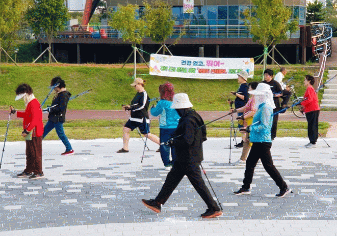 ‘건강 업고 뛰어!’는 매주 화요일 오전, 오후에 1시간씩 황룡강 일원에서 진행된다. 주민들의 수요를 감안해 에어로빅, 생활체조, 노르딕 워킹, 맨발 걷기 등으로 다양하게 구성한 점이 특징이다.
