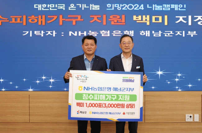 명현관 해남군수는“NH농협은행의 온정 어린 지원에 감사드리며, 피해 주민들에게 큰 위로와 힘이 될 것이다”며“기부해주신 물품은 수해피해가구와 저소득가구에게 잘 전달하겠다”고 전했다.