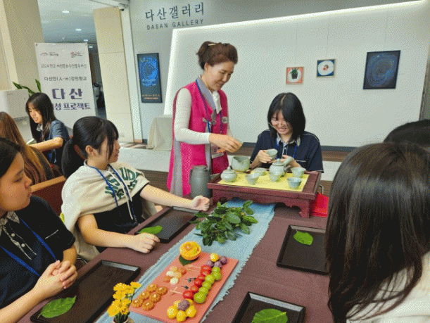 다산박물관 1층에서 진행된 ‘다산황차 다례체험’은 강진에서 직접 채취한 야생차와 강진고려청자 다기를 이용해 학생들이 직접 차를 우리고 마셔보는 체험을 하고, 다산유물전시관에서는 문화관광해설사와 함께 다산의 삶과 정신에 대해 알아보는 시간을 가졌다.