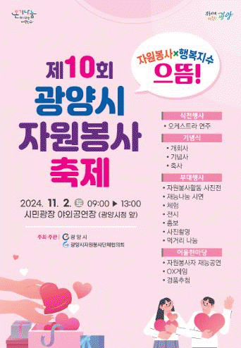 광양시자원봉사단체협의회 주관으로 열리는 이번 행사의 주제는 ‘자원봉사 으뜸 행복 지수 으뜸 광양시’다.