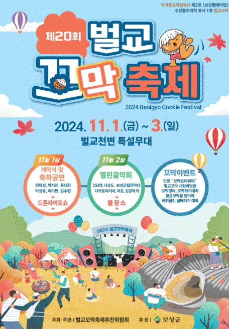 특히, 이날 저녁 6시부터 20번째를 맞이하는 벌교꼬막축제를 기념하고자 진해성, 박서진 등이 함께하는 개막 축하공연과 1,000여 대의 드론을 활용한 ‘드론라이트쇼’가 펼쳐질 예정이다. 단, 안전을 고려해 우천 시 취소되거나 변경 운영될 수 있다.