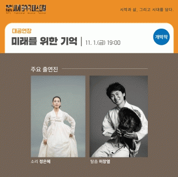 개막작품 ‘미래를 위한 기억’은 김상연 예술감독 연출, 안무-국립무용단 출신 조재혁, 소리-정은혜 명창, 음악-현역 교수들과 국립단체 수석들로 구성된 단체인 ‘긍만고’가 맡아 국내 최고의 아티스트들이 공연으로 축제의 첫 장을 연다.