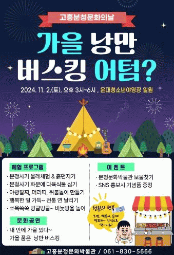 또한, 분청사기를 활용한 다육식물 화분 만들기와 전통 연날리기, 비눗방울 놀이 등 남녀노소 누구나 즐길 수 있는 9가지 무료 체험 행사가 마련되어 있으며, 관람객들은 깊어 가는 가을 감성과 캠핑의 낭만도 함께 느낄 수 있는 뜻깊은 시간이 될 것으로 기대된다.