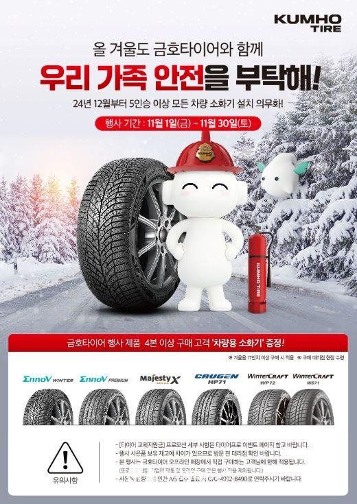 해당 제품을 구매하는 고객에게는 차량용 소화기(4개 구매시)를 제공한다. 차량용 소화기 의무 구비 대상 차종이 올해 12월부터 5인승 이상의 모든 차량으로 확대됨에 따라 차량용 소화기 비치에 대한 중요성이 크게 강조되고 있다. 행사에 관한 자세한 사항은 금호타이어 공식 홈페이지(www.kumhotire.com)를 통해 확인할 수 있다.