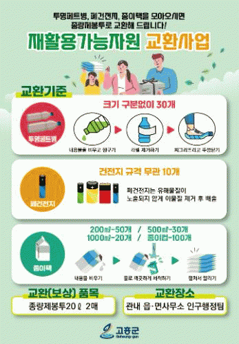 재활용가능자원 교환사업은 일상생활에서 사용 후 버려지는 폐페트병, 폐건전지, 종이팩을 종량제봉투로 교환해 주는 제도로, 주민 1인당 재활용품 분리수거량을 늘리고 군민의 자발적인 참여를 통해 자원 순환 활성화에 기여할 예정이다.