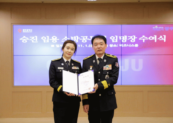광주소방안전본부는 최근(11월1일) 시청 비즈니스룸에서 제6회 소방공무원 세이프(SAFE) 대상에 선정된 왕경선 소방장에게 소방위 임명장을 수여했다.