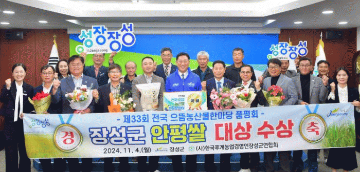 군에 따르면 지난 2일부터 4일 농협 수원유통센터에서 열린 (사)한국후계농업경영인 중앙연합회 ‘제33회 전국으뜸농산물한마당대회’에서 안평쌀 브랜드 ‘장성엔(N)산소미’를 출품한 남균명 씨가 곡류부문 대상인 ‘농림축산식품부 장관상’을 수상했다.