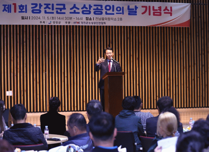 강진원 군수는 ‘제1회 강진군 소상공인의 날’ 기념식을 축하하고, 고물가 고금리 등의 어려움을 버티고 생업을 이겨나가는 소상공인들의 노고를 격려하며, 지역경제의 실핏줄인 소상공인을 위한 지원을 지속적으로 강화하기 위해 지난 6월부터 강진군 소상공인지원센터를 개설했으며, 앞으로도 우리 지역의 소상공인을 위한 지원을 확대할 것 등을 약속했다.