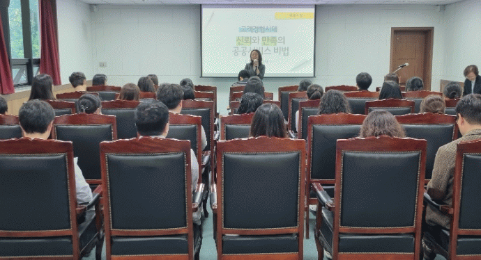강사는 ‘고객 경험시대 신뢰와 만족의 공공서비스 비법’이라는 주제로 ▲민원인의 니즈 파악 및 심리 이해하기 ▲친절한 대화의 법칙 ▲주요 민원 응대 사례 공유 등 민원담당자의 대민 업무에 도움이 되는 내용을 교육했다.