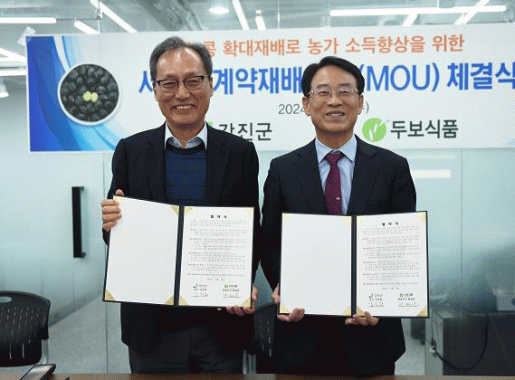 군은 이날 협약으로 고품질 서리태(청자5호) 생산단지(150ha) 조성을 통한 지속적인 원료곡 생산으로 소득화의 기반을 마련할 것으로 기대되며, ㈜두보식품은 종자공급은 물론 강진산 서리태를 이용한 제품개발 및 안정적인 원료곡 수매 등을 지원키로 했다.