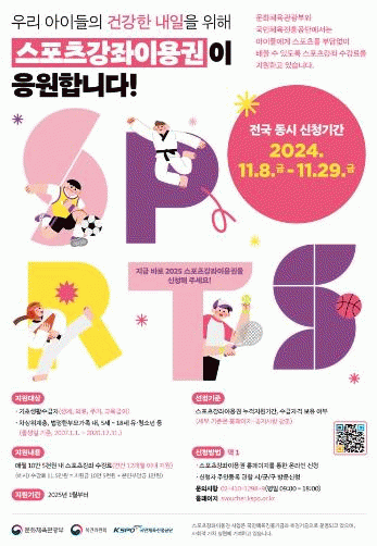 2025년도 스포츠강좌이용권 지원 대상자는 기초생활수급가구, 차상위계층, 법정 한부모 지원 가족 만 5세부터 18세 유·청소년이며, 장애인 스포츠강좌이용권 지원 대상자는 만5~69세 등록 장애인이다.