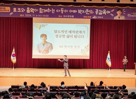 2차 행사는 지난 6일 여수문화홀에서 진행한 ‘토크와 음악이 있는 박지헌의 공감육아’ 강연으로, 대한민국 대표 다둥이 아빠인 V.O.S 박지헌 가수가 강사로 나서 임산부, 신혼·예비부부, 난임·출산가정 등 230여 명에게 생생한 6남매 육아 경험을 공유했다.