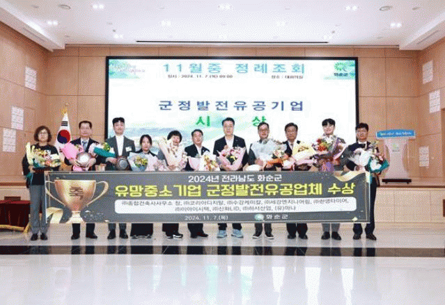 화순군은 산업현장에서 지역 경제 활성화와 일자리 창출을 통해 군정 발전에 앞장서 온 관내 중소기업 9개 사를 대상으로 군정 발전 유공 기업 표창을 수여했다.