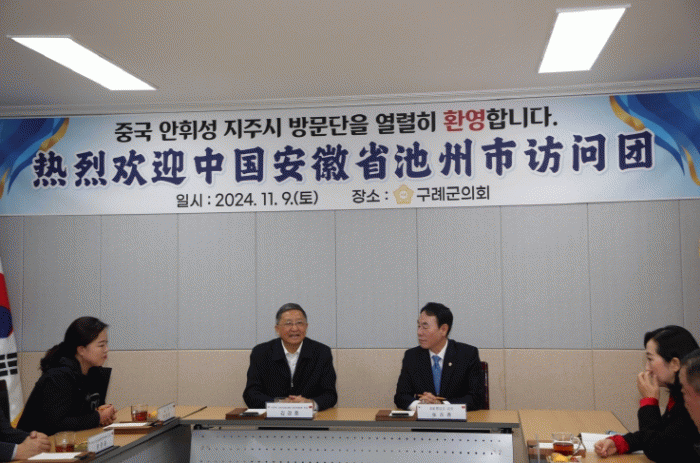 중국 지주시 인민대회 김경풍 주임 등으로 구성된 지주시 대표단은 지난 8일부터 2박 3일의 일정으로 구례군을 방문했으며, 특히 둘째 날에는 구례군의회에서 장길선 의장과 군 의회 의원들을 접견하고 양 도시 발전 방안 및 의회-인민대회간 교류 방안에 대해 논의했다.