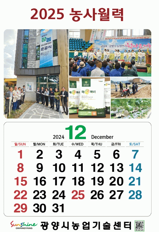 이은희 기술보급과장은 “농사월력을 토대로 농사 일정을 계획하면 시기를 놓치지 않고 영농을 할 수 있다, 광양시청과 농업기술센터 홈페이지로 연결되는 QR코드도 농사월력에 인쇄되어 있으니 많이 이용해보시기를 바란다”라고 말했다.