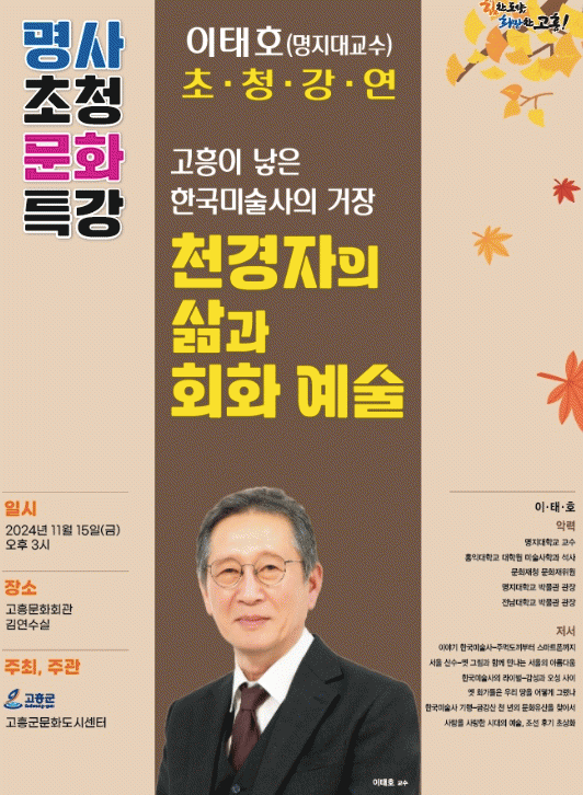 강연을 맡은 이태호 교수(명지대학교)는 홍익대학교 미술대학 회화과를 졸업한 후, 동 대학원에서 미학·미술사학 석사학위를 취득했다. 그는 국립중앙박물관과 국립광주박물관에서 학예연구사로 활동했으며, 전남대학교 교수, 명지대학교 미술사학과 교수, 문화재청 문화재위원 등을 역임한 한국 미술계의 대표적인 역사학자이다. 주요 저서로는 ▲우리 시대 우리 미술 ▲풍속화 ▲조선 후기 회화의 사실 정신 ▲조선미술사 기행 등이 있다.