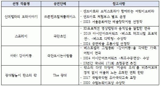 이 과정을 통해 전국 139개 공연장이 평균 1.3억 원(2.4편)을 지원받아 오는 2025년 300여 작품을 선보이는데 이 중 강진군은 약 1.7억 원의 국비를 확보, 총 네 작품을 5월부터 선보일 예정이다.