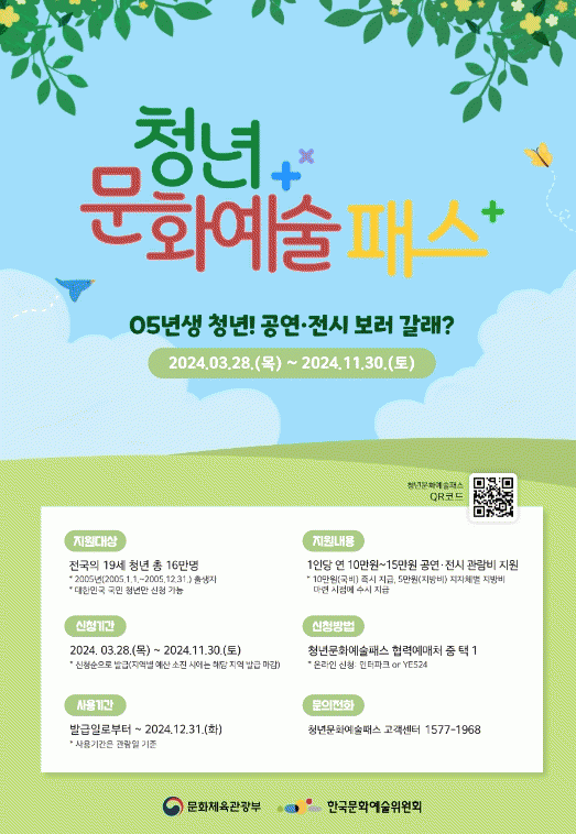‘청년문화예술패스’ 사업은 사회에 첫발을 내딛는 청년에게 문화예술 향유 기회를 제공하기 위해 예술 분야 공연(연극·뮤지컬·클래식·오페라·발레·무용·합창·국악 등)과 전시 관람비를 연간 최대 15만 원 지원하며, 올해 최초로 시행하는 사업이다.
