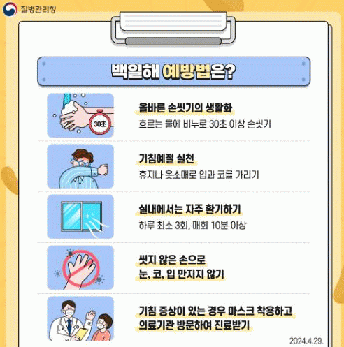 백일해를 예방하기 위해서는 ▲올바른 손 씻기(흐르는 물에 비누로 30초 이상 씻기) ▲기침 예절 실천(휴지나 옷소매로 입과 코 가리기) ▲실내에서는 자주 환기하기(하루 최소 3회, 매회 10분 이상) ▲씻기 않은 손으로 눈, 코, 입 만지지 않기 ▲기침 증상이 있는 경우 마스크 착용하고 의료기관 방문하여 진료받기 ▲적기 예방접종 받기 등 예방수칙을 준수해야 한다.