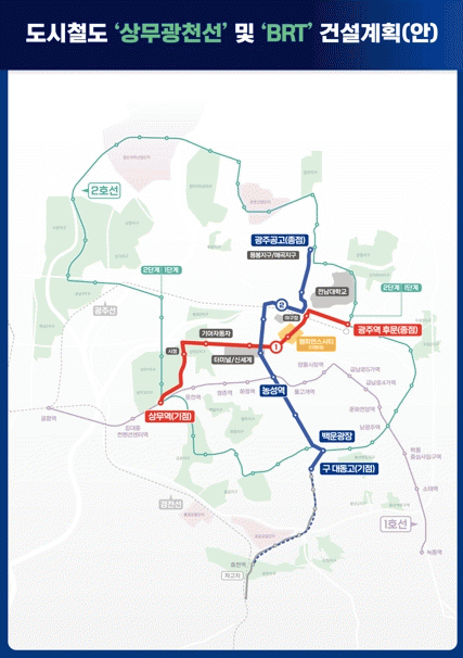 ‘광천상무선’의 총 사업비는 6925억원(국비 4155억원, 시비 2770억원)이며, ‘BRT’의 총 사업비는 526억원(국비 205억원, 시비 321억원)으로 추정된다. 광천상무선과 BRT의 시비 부담액 3091억원은 광주시 재정 부담 없이 옛 방직공장터 개발과 광천터미널 복합화 사업의 공공기여금을 활용할 계획이다.