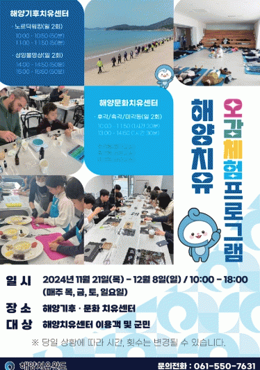 프로그램은 해양치유센터 이용객, 지역민 누구나 참여할 수 있으며, 이용 요금은 기후치유 소인 6,000원, 대인 10,000원, 문화치유는 소인·대인 20,000원이다.