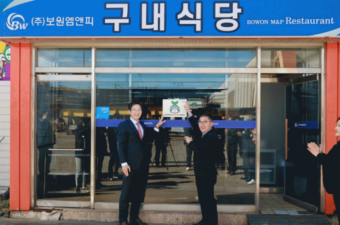 우승희 영암군수와 배영수 영암쌀조합공동사업법인 대표는, 영암쌀을 대표해 마광식 ㈜보원엠앤피 대표이사, 김미영 구내식당 운영 대표에게 감사의 인사를 전하고, 식당 정문에 함께 현판을 달고, 영암사랑상품권도 전달했다.