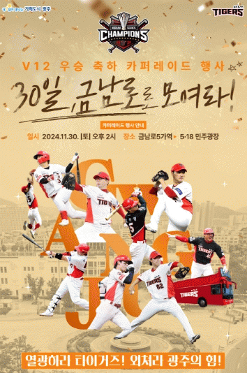 광주광역시는 KIA 타이거즈와 함께 오는 30일 오후 2시 동구 금남로5가역부터 5·18민주광장까지 1.2㎞ 구간에서 KIA 타이거즈의 한국시리즈 ‘V12’ 우승을 축하하는 카퍼레이드를 연다.